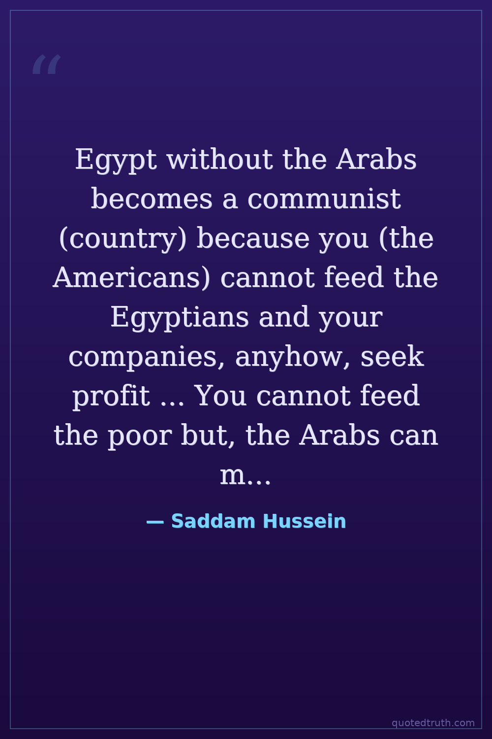 Egypt without the Arabs becomes a communist (country) because you (the Americans) cannot feed the Egyptians and your companies, anyhow, seek profit ... You cannot feed the poor but, the Arabs can make use of Egypt as an Arab Egypt and at the same time Egypt can benefit from the Arab economic and commercial depth.