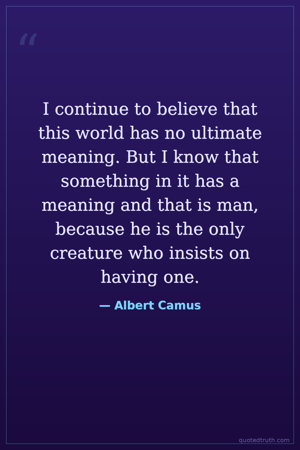 I continue to believe that this world has no ultimate meaning. But I know that something in it has a meaning and that is man, because he is the only creature who insists on having one.