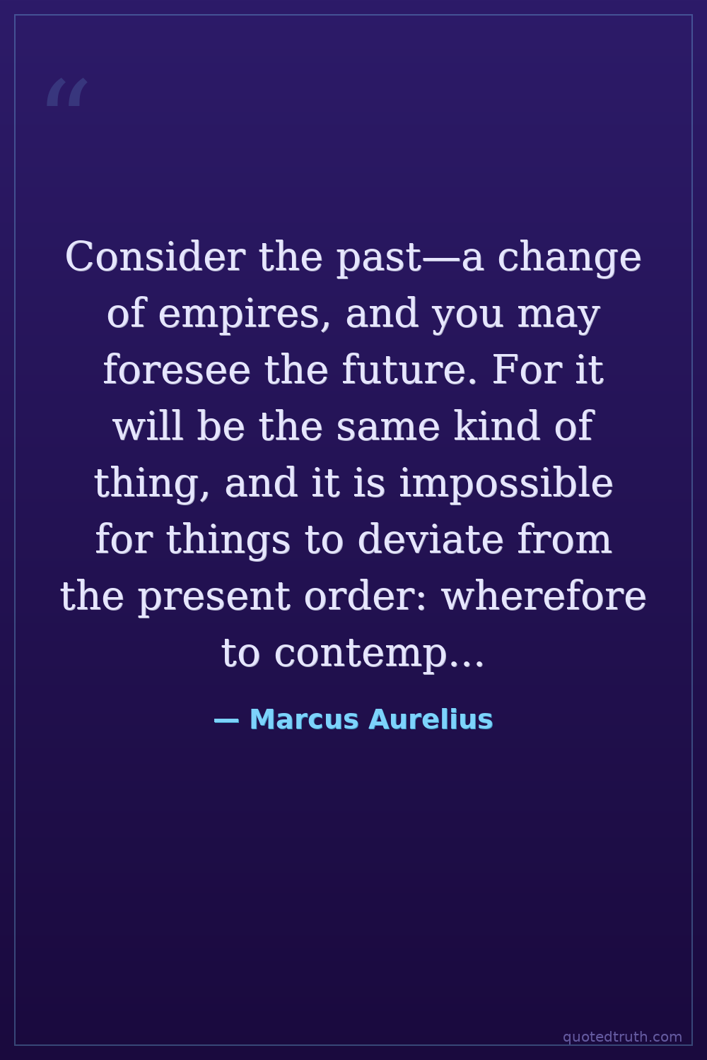 Consider the past—a change of empires, and you may foresee the future. For it will be the same kind of thing, and it is impossible for things to deviate from the present order: wherefore to contemplate life for forty years is the same as to contemplate it for ten thousand years. For what more wilt thou see?