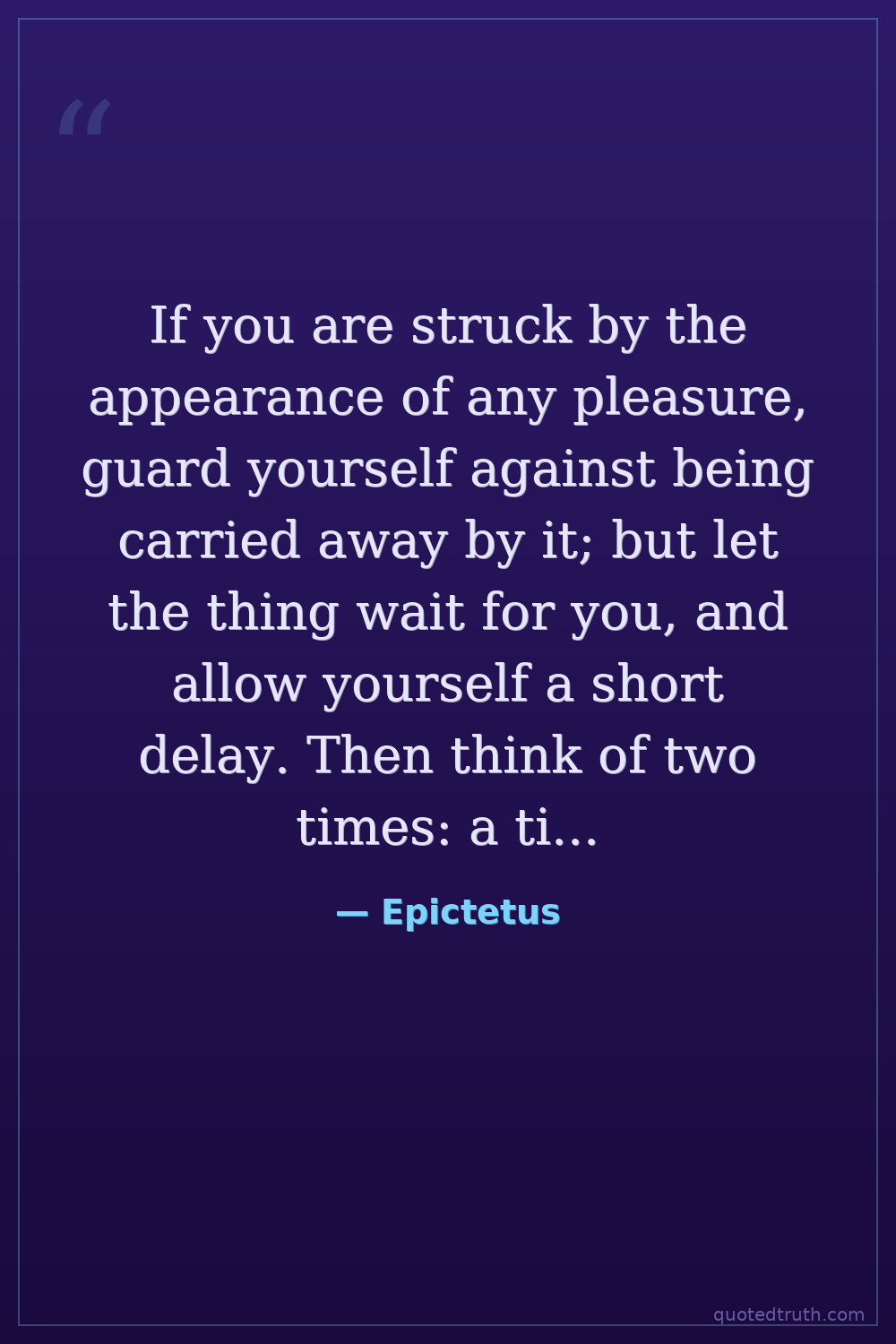 If you are struck by the appearance of any pleasure, guard yourself against being carried away by it; but let the thing wait for you, and allow yourself a short delay. Then think of two times: a time when you will enjoy the pleasure, and a time after you have enjoyed it, and repent and reproach yourself.