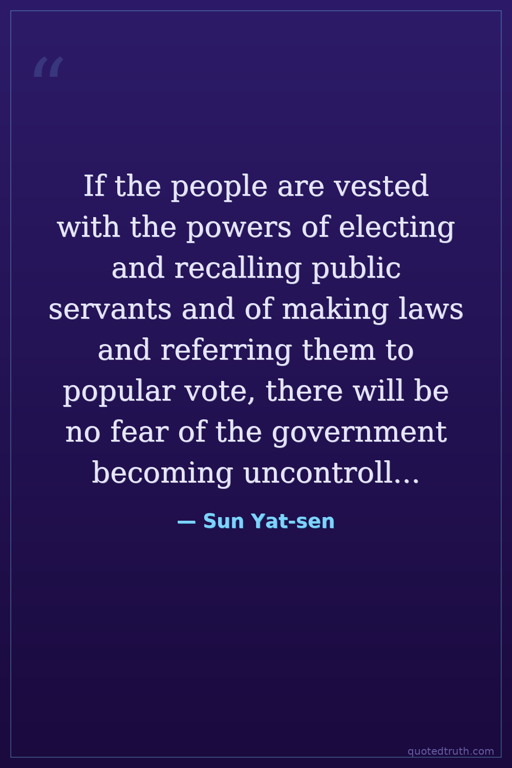 If the people are vested with the powers of electing and recalling public servants and of making laws and referring them to popular vote, there will be no fear of the government becoming uncontrollable.