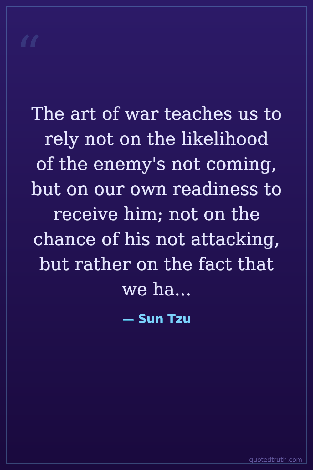 The art of war teaches us to rely not on the likelihood of the enemy's not coming, but on our own readiness to receive him; not on the chance of his not attacking, but rather on the fact that we have made our position unassailable.