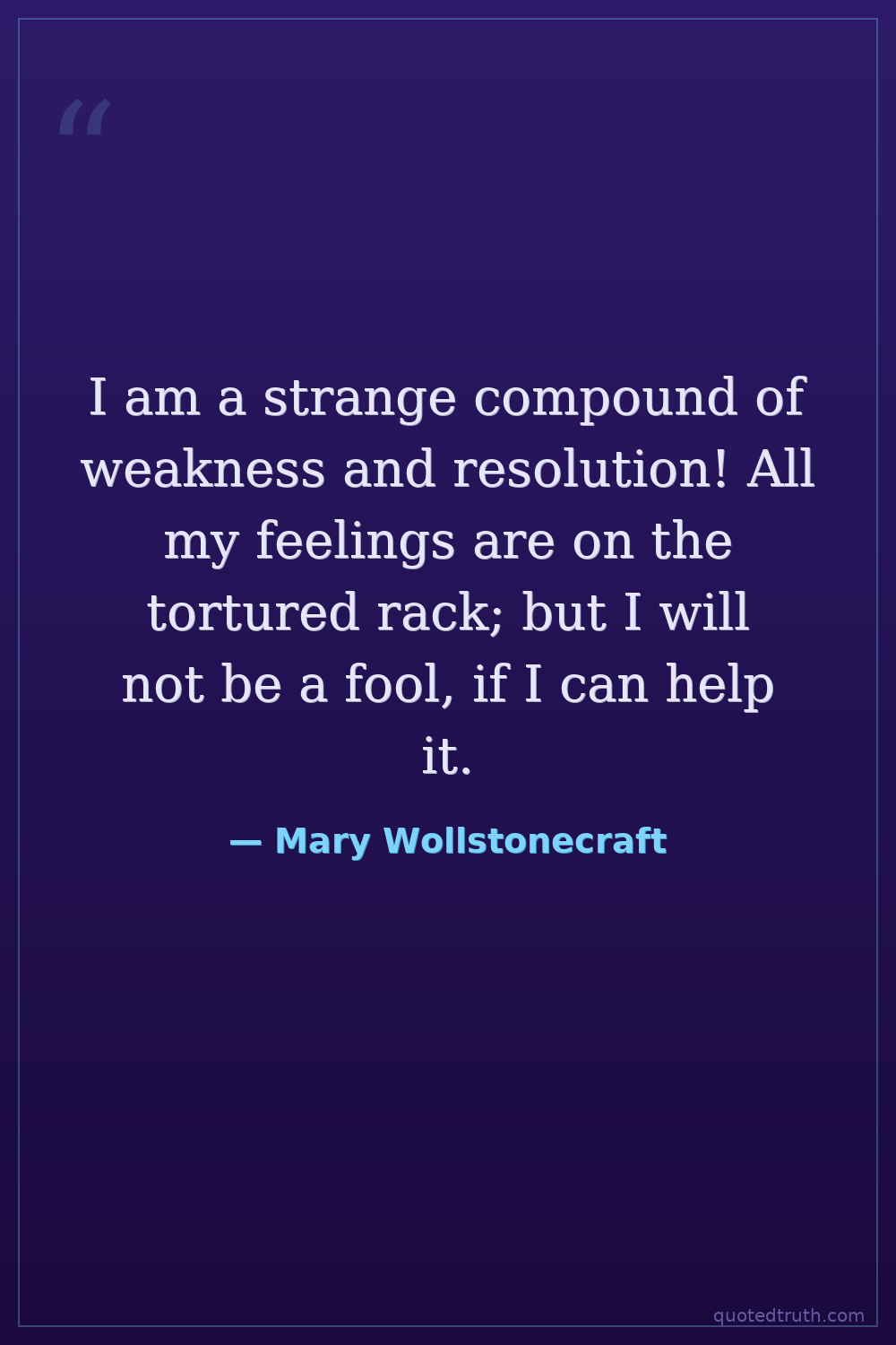 I am a strange compound of weakness and resolution! All my feelings are on the tortured rack; but I will not be a fool, if I can help it.