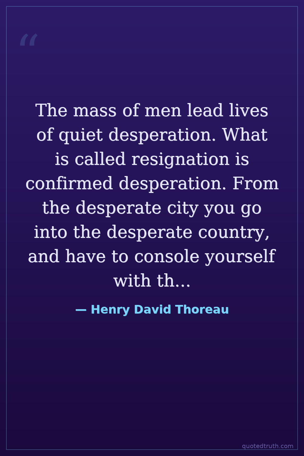 The mass of men lead lives of quiet desperation. What is called resignation is confirmed desperation. From the desperate city you go into the desperate country, and have to console yourself with the bravery of minks and muskrats. A stereotyped but unconscious despair is concealed even under what are called the games and amusements of mankind. There is no play in them, for this comes after work. But it is a characteristic of wisdom not to do desperate things.