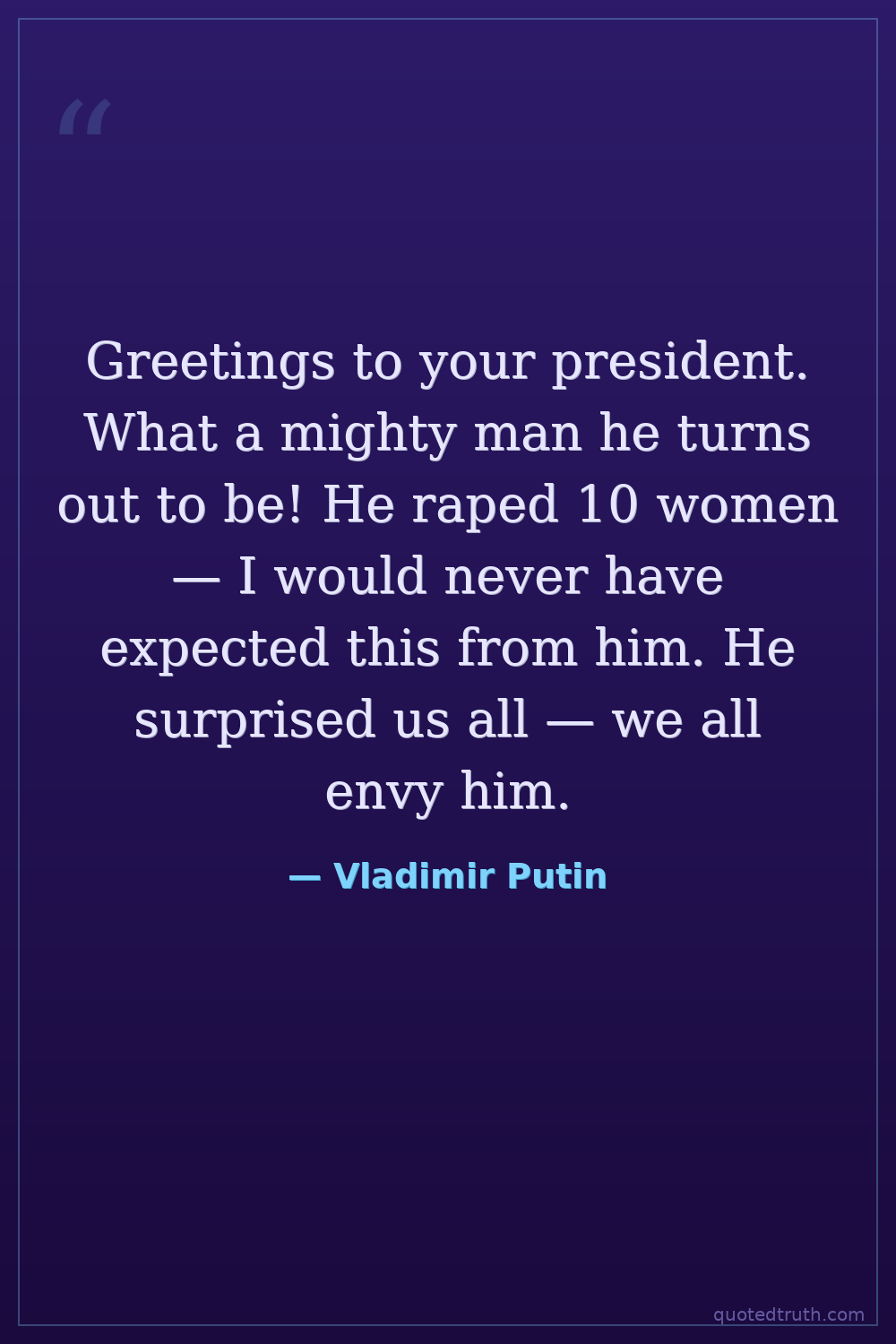 Greetings to your president. What a mighty man he turns out to be! He raped 10 women — I would never have expected this from him. He surprised us all — we all envy him.