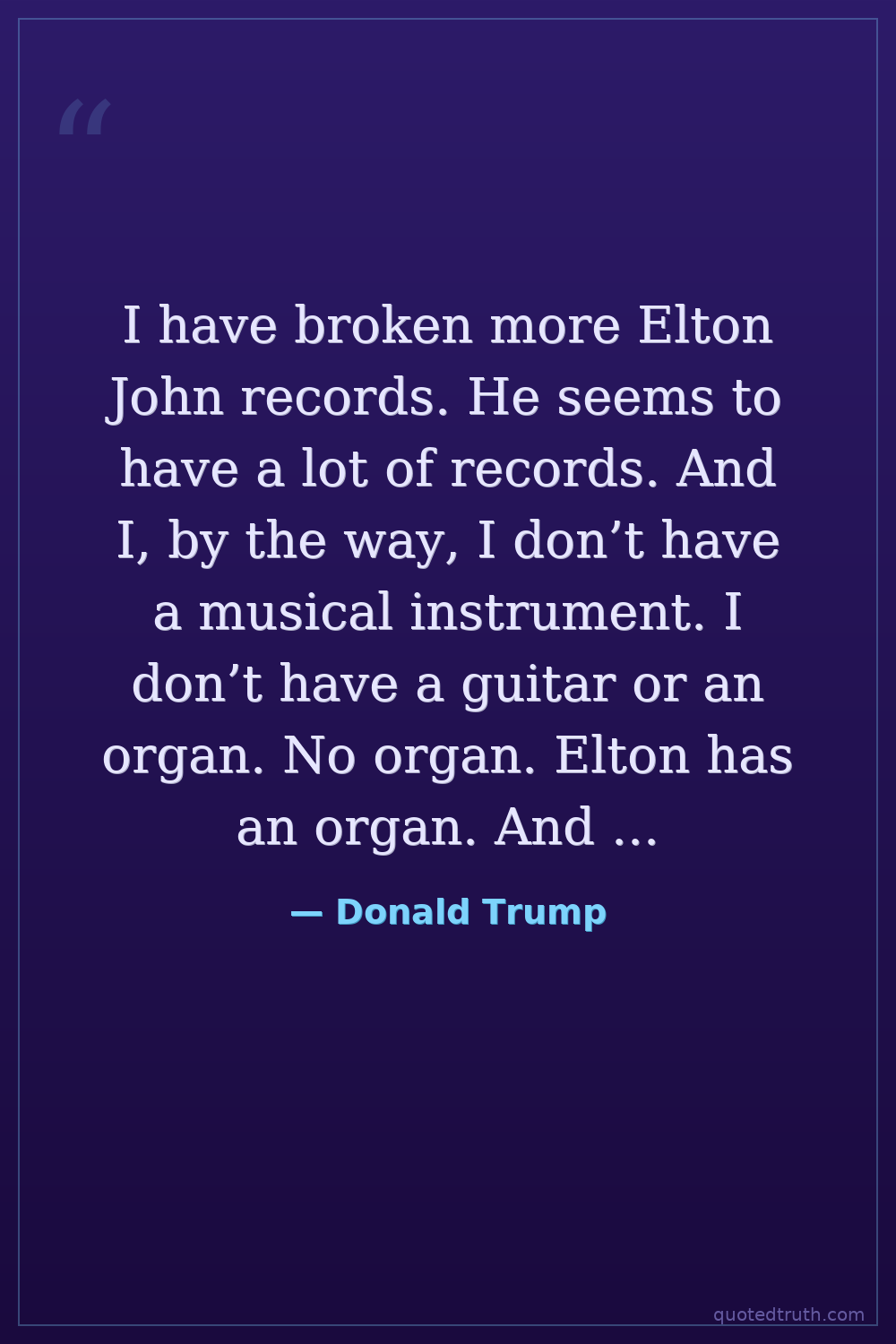 I have broken more Elton John records. He seems to have a lot of records. And I, by the way, I don’t have a musical instrument. I don’t have a guitar or an organ. No organ. Elton has an organ. And lots of other people helping. No, we’ve broken a lot of records. We’ve broken virtually every record.