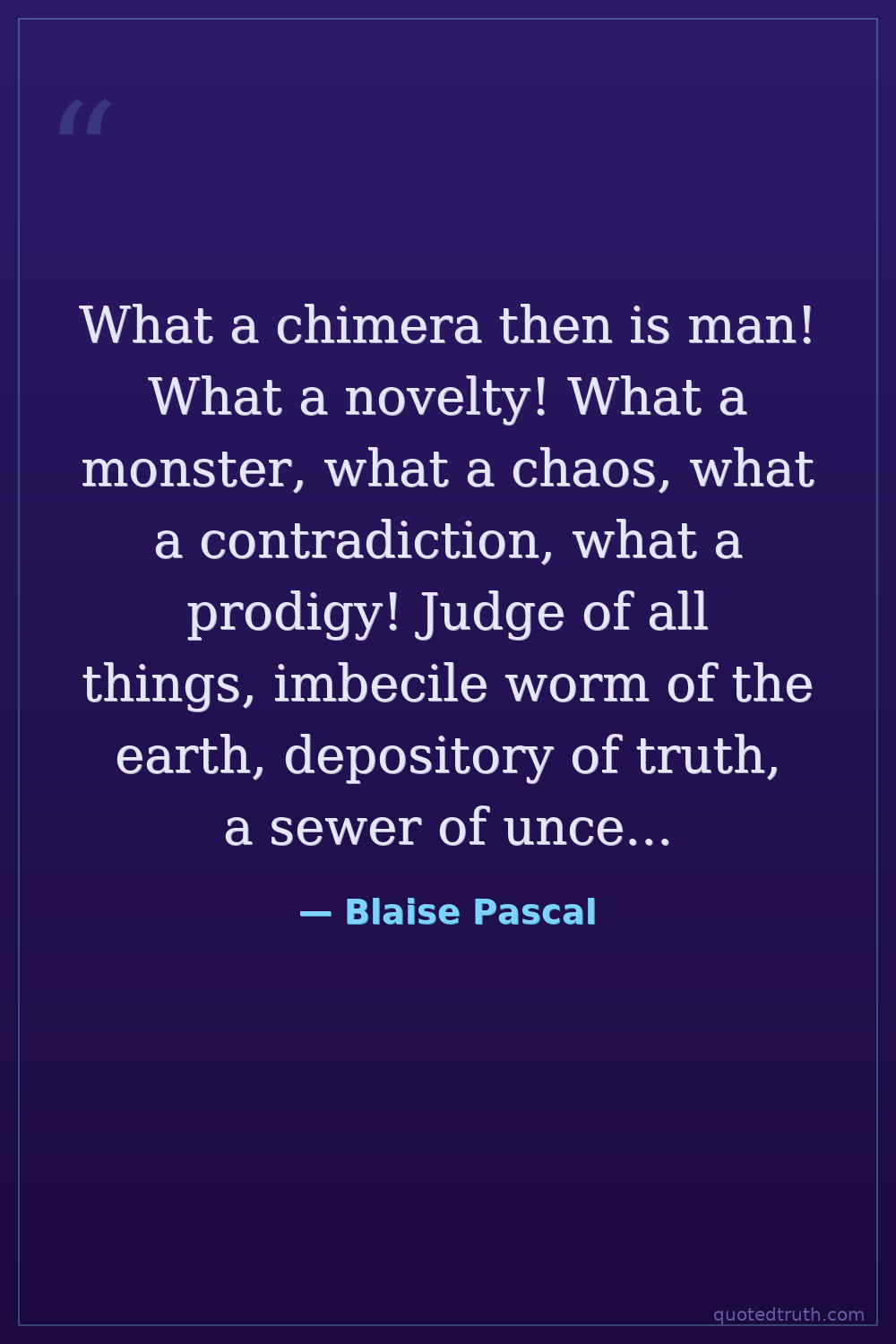 What a chimera then is man! What a novelty! What a monster, what a chaos, what a contradiction, what a prodigy! Judge of all things, imbecile worm of the earth, depository of truth, a sewer of uncertainty and error, the glory and the scum of the universe!