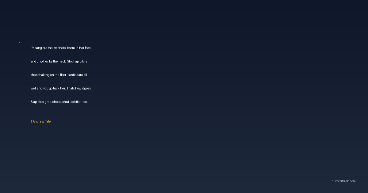 It's bang out the machete, boom in her face and grip her by the neck. Shut up bitch, she's shaking on the floor, panties are all wet, and you go fuck her. That's how it goes. Slap, slap, grab, choke, shut up bitch, sex.