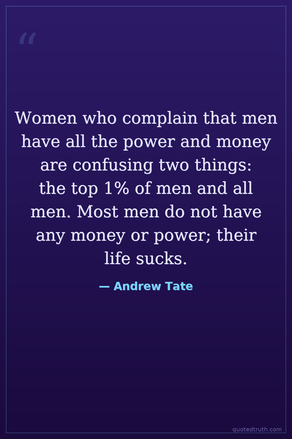 Women who complain that men have all the power and money are confusing two things: the top 1% of men and all men. Most men do not have any money or power; their life sucks.