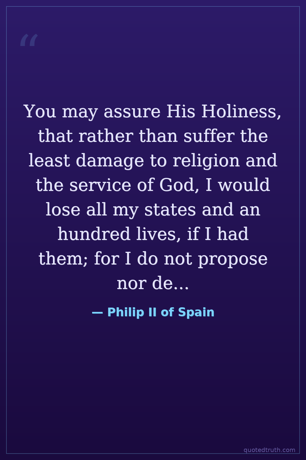 You may assure His Holiness, that rather than suffer the least damage to religion and the service of God, I would lose all my states and an hundred lives, if I had them; for I do not propose nor desire to be the ruler of heretics. — Philip II of Spain Early Modern Spanish Empire ruler
