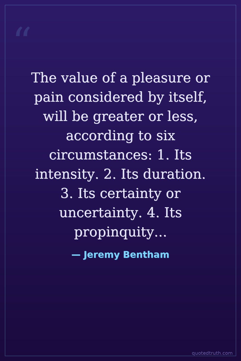The value of a pleasure or pain considered by itself, will be greater or less, according to six circumstances: 1. Its intensity. 2. Its duration. 3. Its certainty or uncertainty. 4. Its propinquity or remoteness. 5. Its fecundity. 6. Its purity.