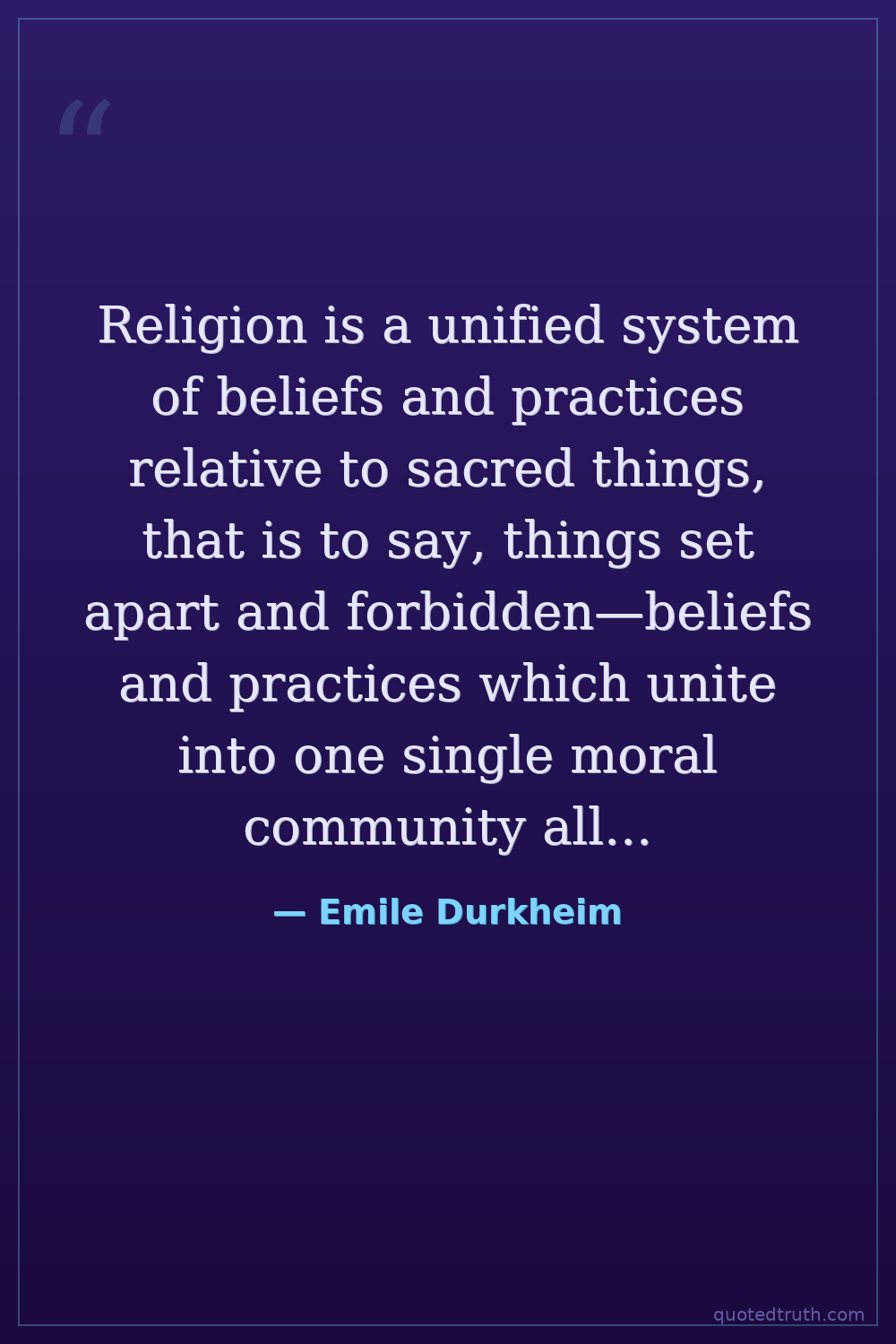 Religion is a unified system of beliefs and practices relative to sacred things, that is to say, things set apart and forbidden—beliefs and practices which unite into one single moral community all those who adhere to them.