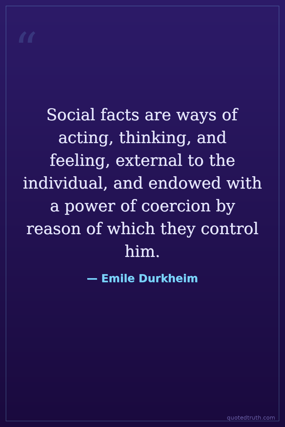 Social facts are ways of acting, thinking, and feeling, external to the individual, and endowed with a power of coercion by reason of which they control him.