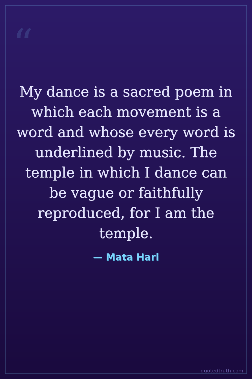 My dance is a sacred poem in which each movement is a word and whose every word is underlined by music. The temple in which I dance can be vague or faithfully reproduced, for I am the temple.