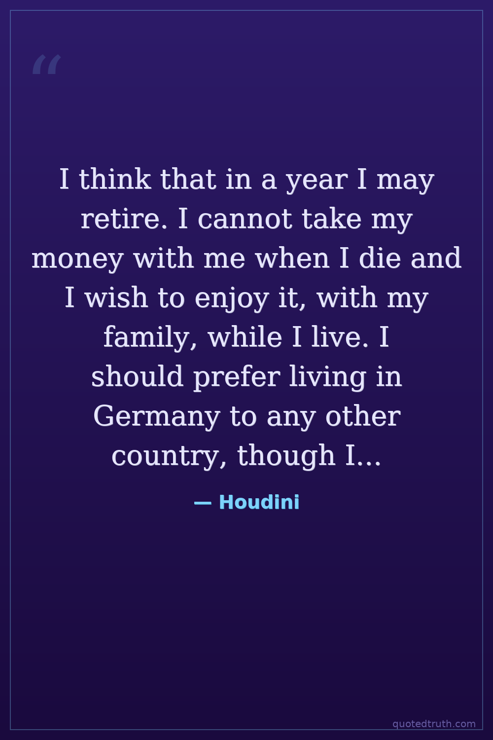I think that in a year I may retire. I cannot take my money with me when I die and I wish to enjoy it, with my family, while I live. I should prefer living in Germany to any other country, though I am an American, and am loyal to my country.