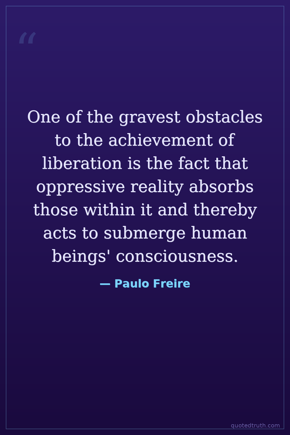 One of the gravest obstacles to the achievement of liberation is the fact that oppressive reality absorbs those within it and thereby acts to submerge human beings' consciousness.