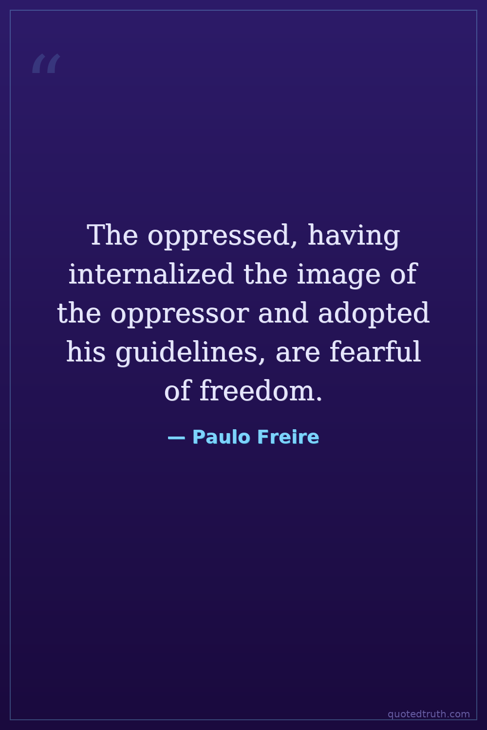 The oppressed, having internalized the image of the oppressor and adopted his guidelines, are fearful of freedom.
