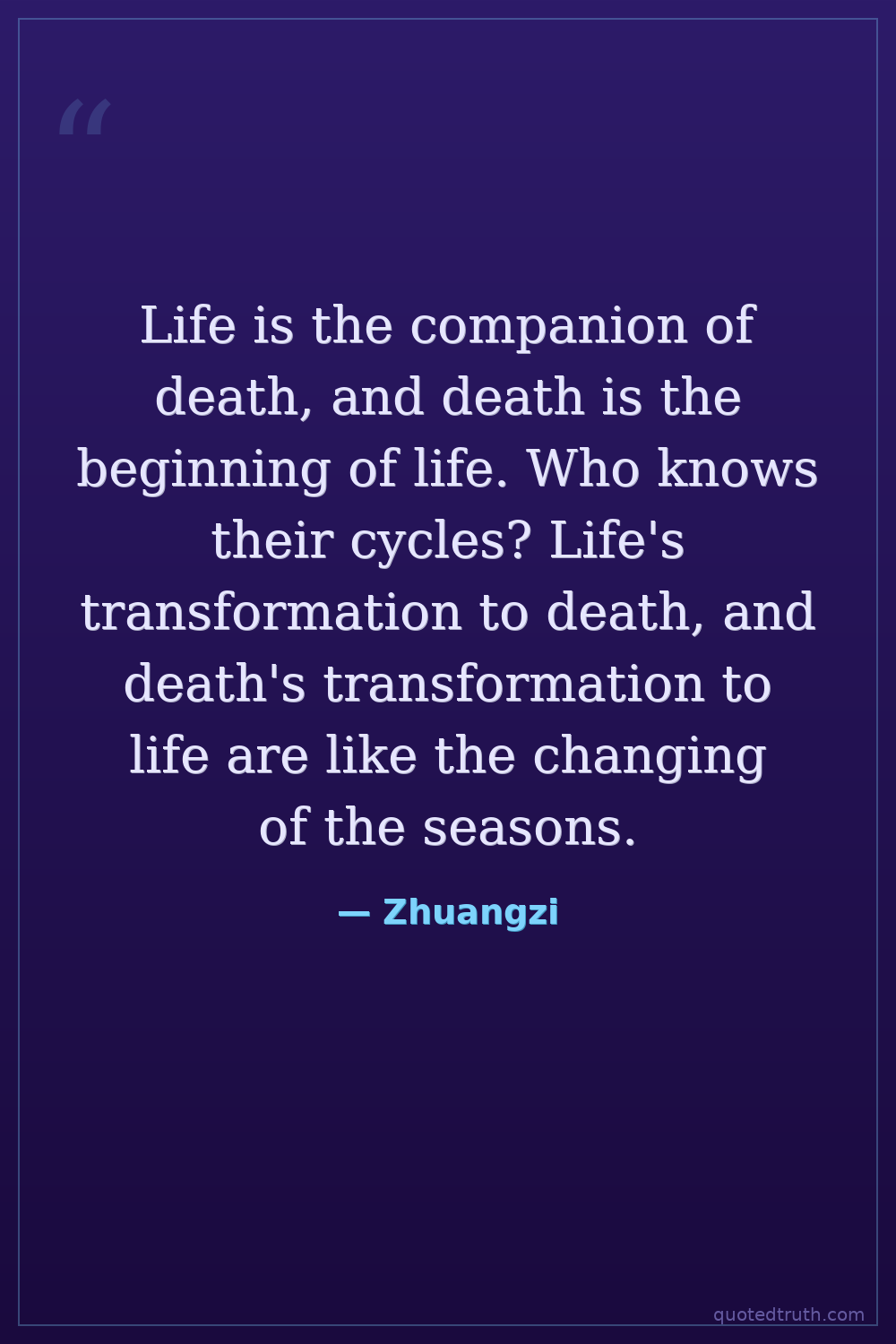 Life is the companion of death, and death is the beginning of life. Who knows their cycles? Life's transformation to death, and death's transformation to life are like the changing of the seasons.