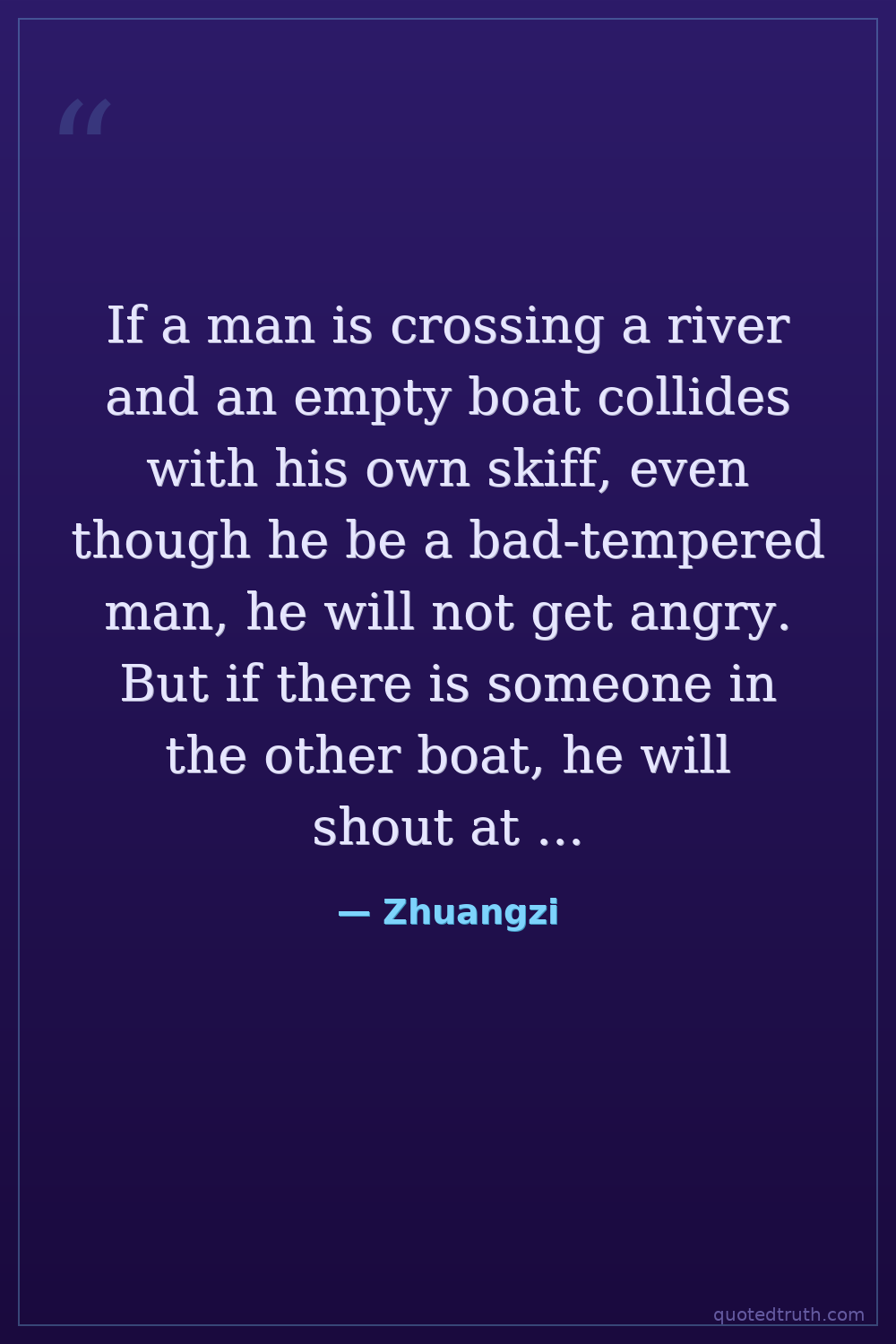 If a man is crossing a river and an empty boat collides with his own skiff, even though he be a bad-tempered man, he will not get angry. But if there is someone in the other boat, he will shout at him to steer clear. If the shout is not heard, he will shout again, and yet again, and begin to curse. And all because there is someone in the other boat. Yet if the boat was empty, he would not be angry. You can apply this to the world. If you can empty your own boat, you will be able to cross the rivers of the world, and no one will oppose you.