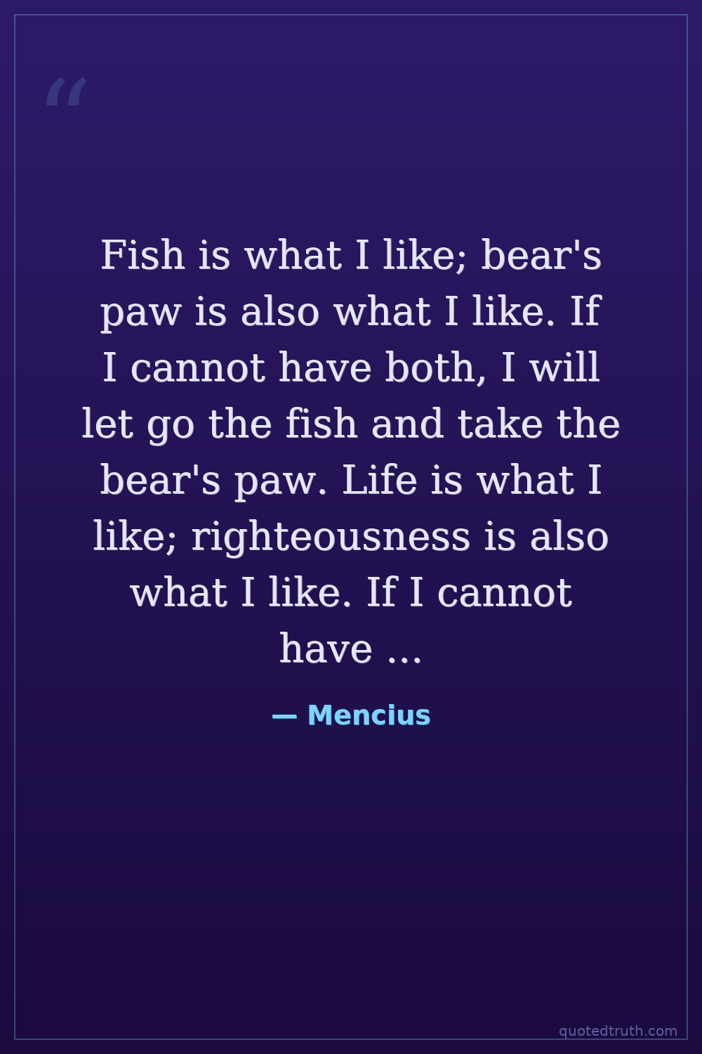 Fish is what I like; bear's paw is also what I like. If I cannot have both, I will let go the fish and take the bear's paw. Life is what I like; righteousness is also what I like. If I cannot have both, I will let go life and take righteousness.