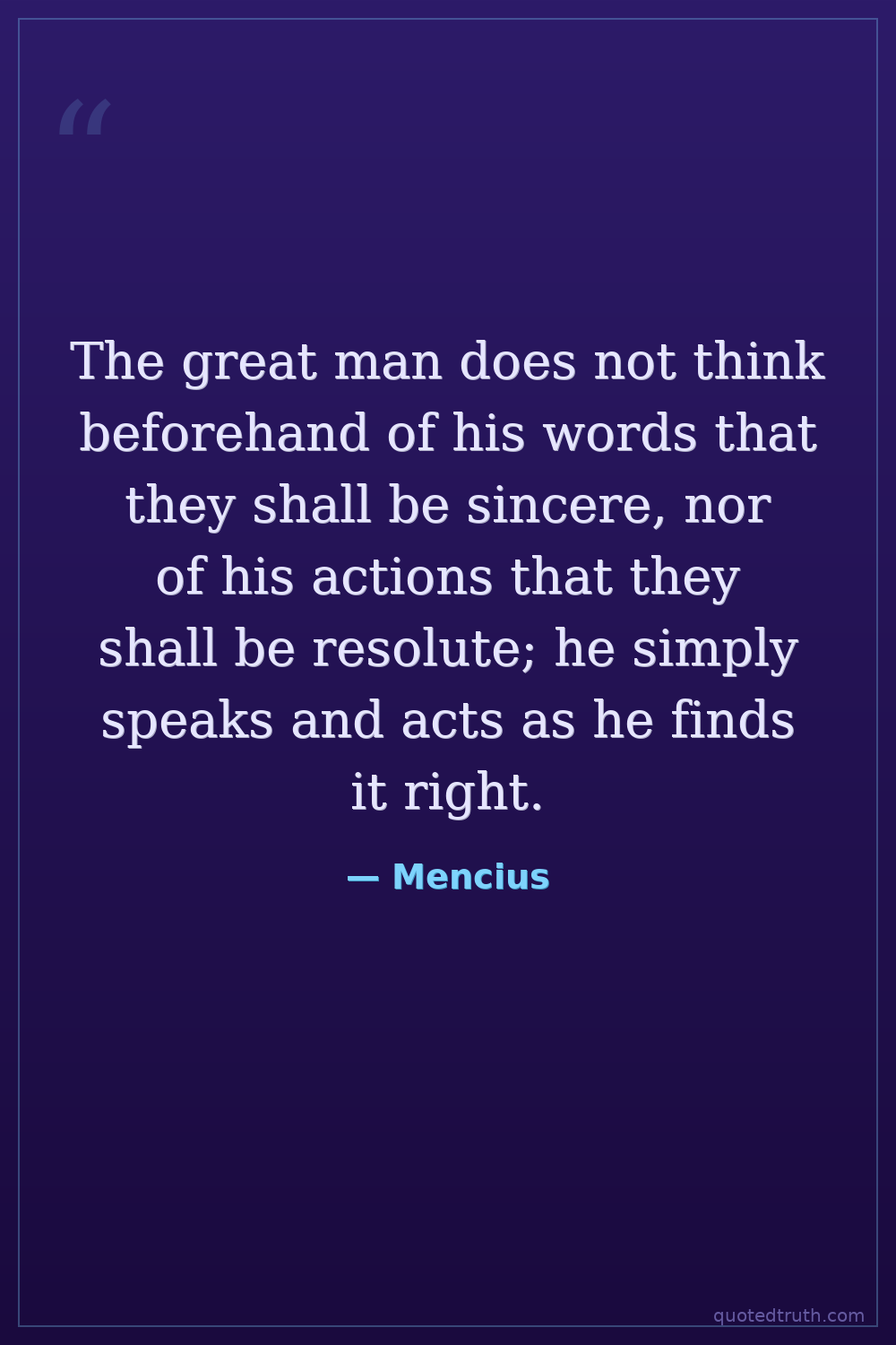 The great man does not think beforehand of his words that they shall be sincere, nor of his actions that they shall be resolute; he simply speaks and acts as he finds it right.