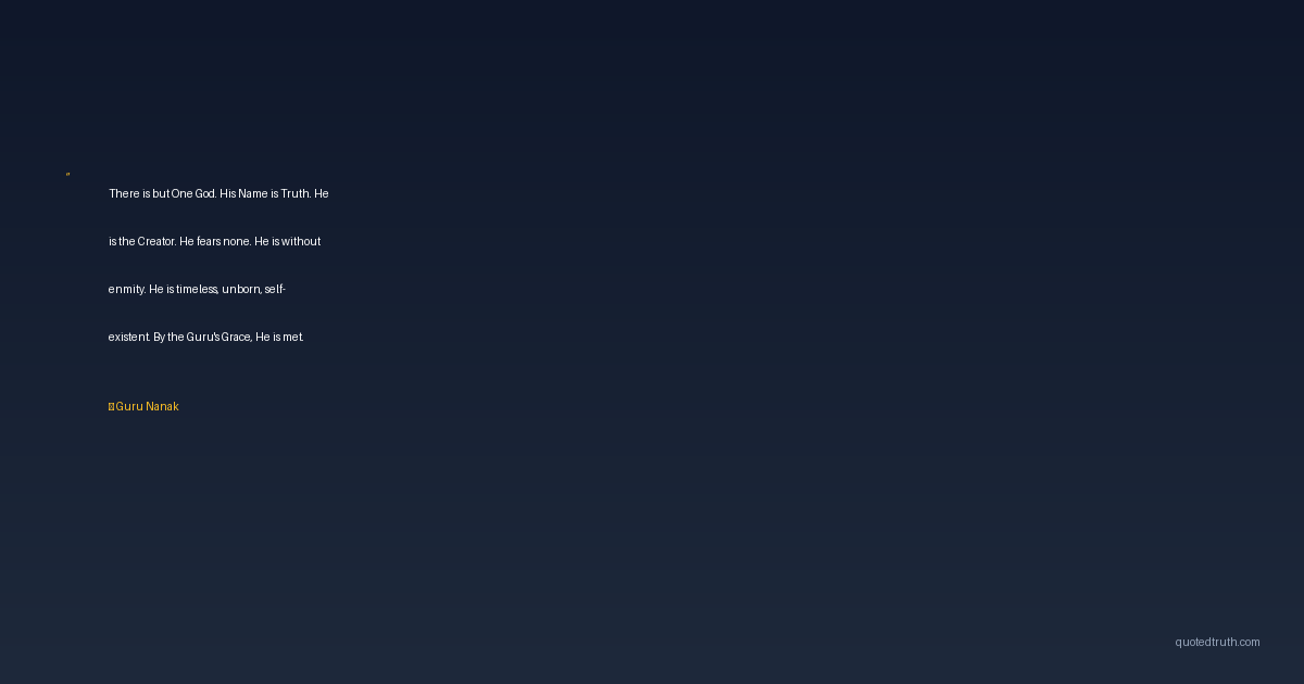 There is but One God. His Name is Truth. He is the Creator. He fears none. He is without enmity. He is timeless, unborn, self-existent. By the Guru's Grace, He is met.