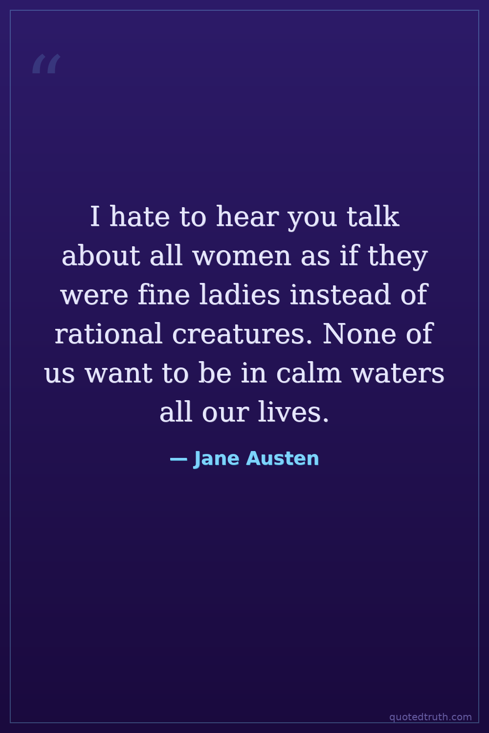 I hate to hear you talk about all women as if they were fine ladies instead of rational creatures. None of us want to be in calm waters all our lives.