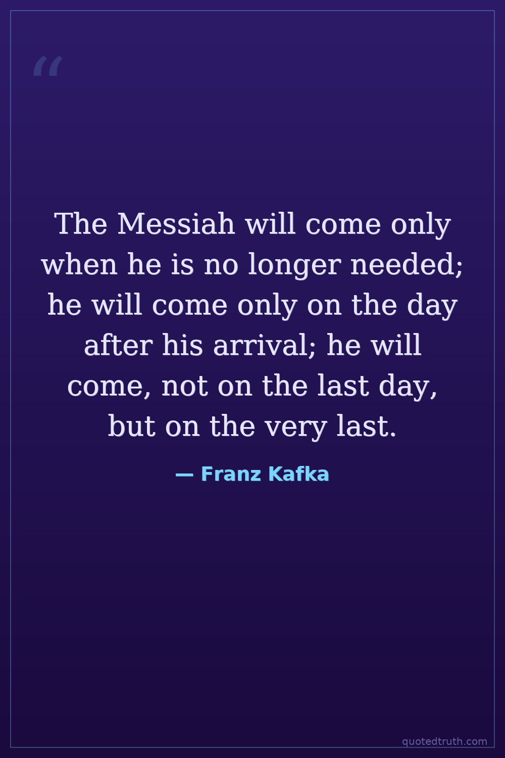 The Messiah will come only when he is no longer needed; he will come only on the day after his arrival; he will come, not on the last day, but on the very last.