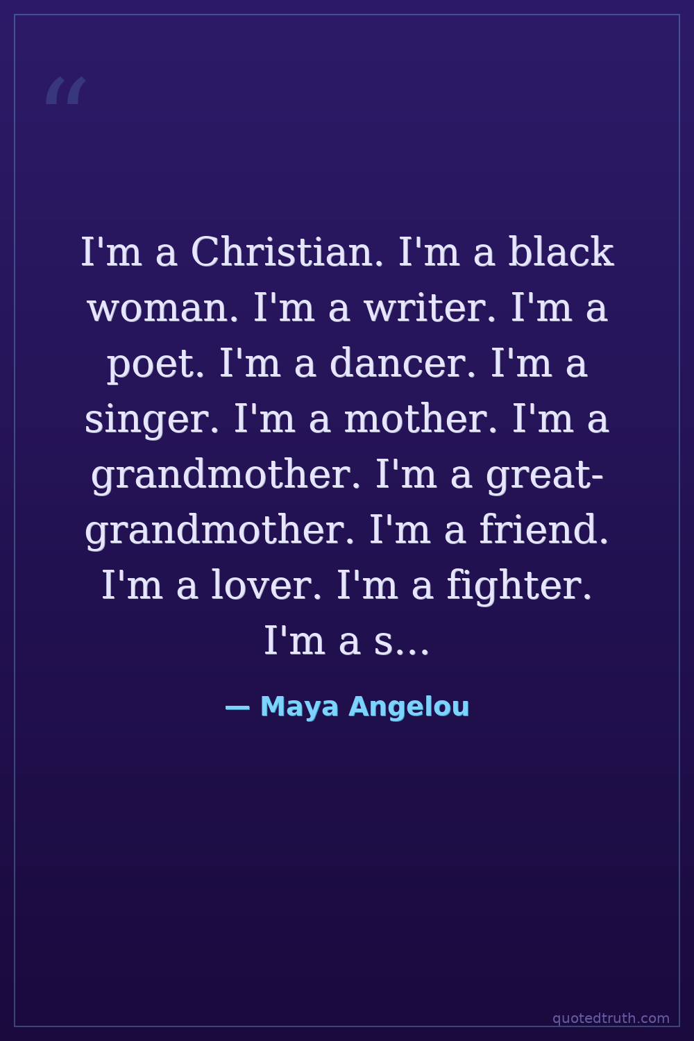 I'm a Christian. I'm a black woman. I'm a writer. I'm a poet. I'm a dancer. I'm a singer. I'm a mother. I'm a grandmother. I'm a great-grandmother. I'm a friend. I'm a lover. I'm a fighter. I'm a survivor. I'm a healer. And I'm a human being.
