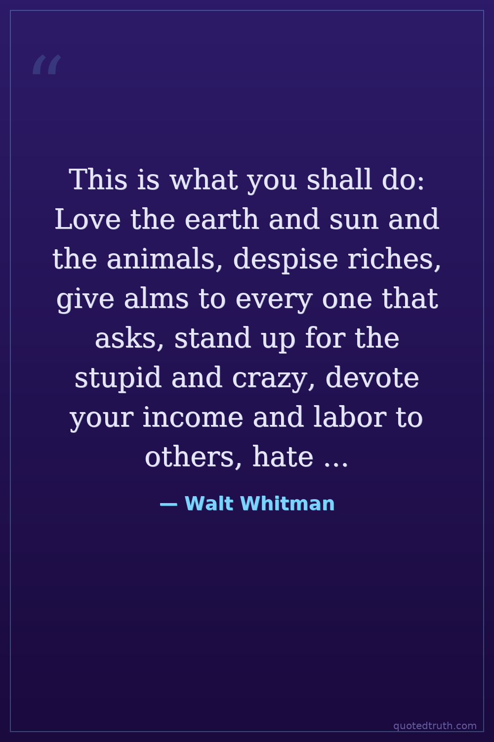 This is what you shall do: Love the earth and sun and the animals, despise riches, give alms to every one that asks, stand up for the stupid and crazy, devote your income and labor to others, hate tyrants, argue not concerning God, have patience and indulgence toward the people, take off your hat to nothing known or unknown or to any man or number of men, go freely with powerful uneducated persons and with the young and with the mothers of families, read these leaves in the open air every season of every year of your life, re-examine all you have been told at school or church or in any book, dismiss whatever insults your own soul, and your very flesh shall be a great poem and have the richest fluency not only in its words but in the silent lines of its lips and face and between the lashes of your eyes and in every motion and joint of your body.