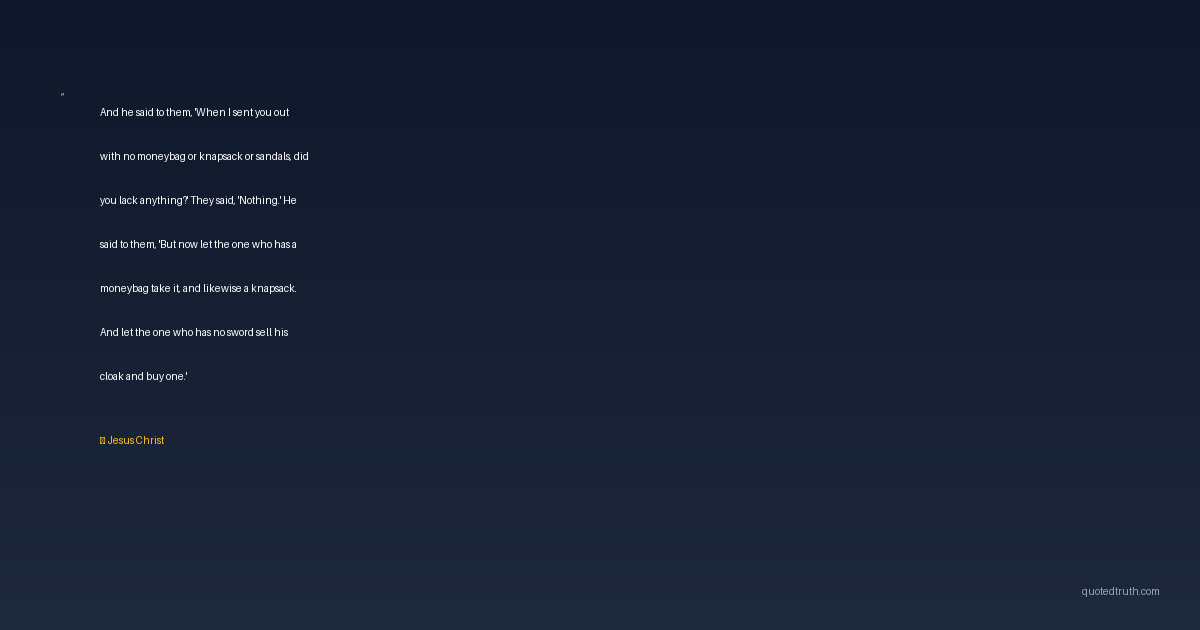 And he said to them, 'When I sent you out with no moneybag or knapsack or sandals, did you lack anything?' They said, 'Nothing.' He said to them, 'But now let the one who has a moneybag take it, and likewise a knapsack. And let the one who has no sword sell his cloak and buy one.'