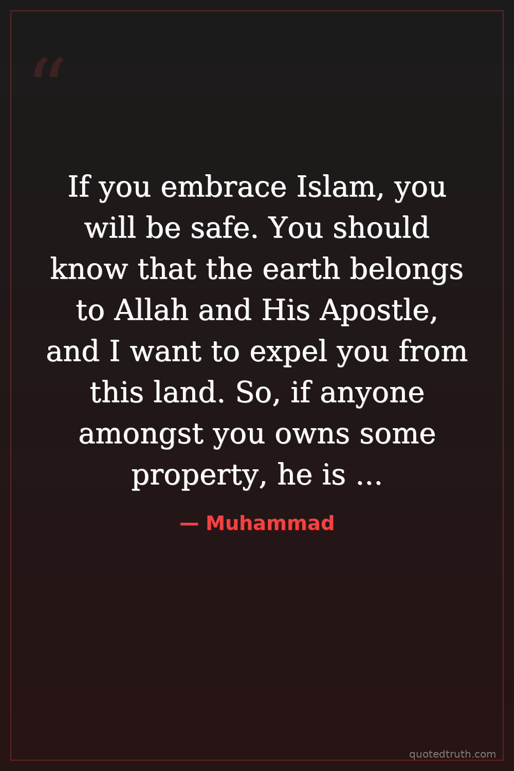 If you embrace Islam, you will be safe. You should know that the earth belongs to Allah and His Apostle, and I want to expel you from this land. So, if anyone amongst you owns some property, he is permitted to sell it, otherwise you should know that the Earth belongs to Allah and His Apostle.