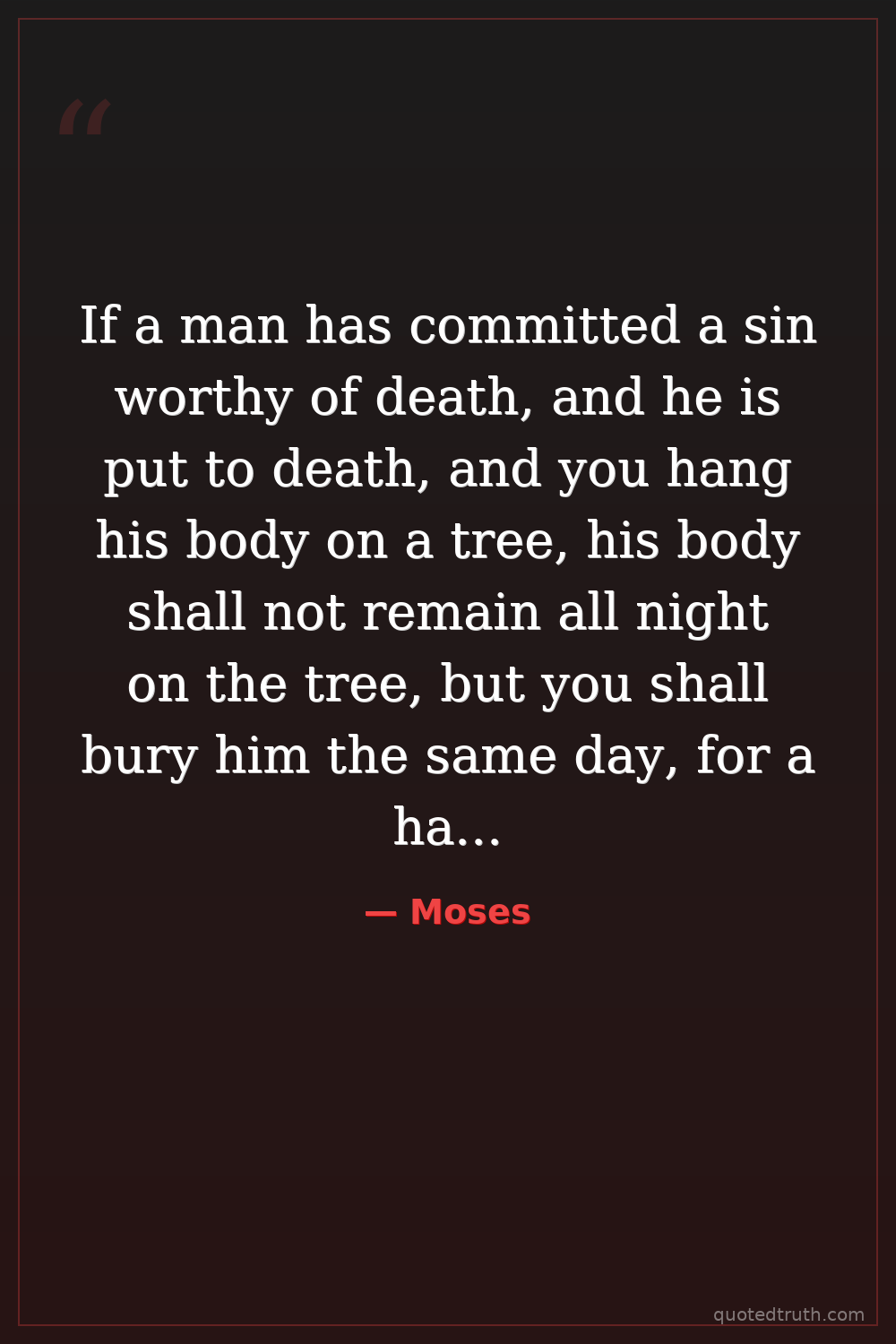 If a man has committed a sin worthy of death, and he is put to death, and you hang his body on a tree, his body shall not remain all night on the tree, but you shall bury him the same day, for a hanged man is cursed by God.