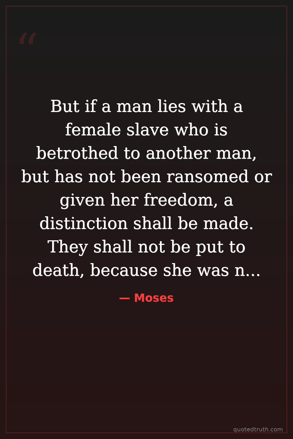 But if a man lies with a female slave who is betrothed to another man, but has not been ransomed or given her freedom, a distinction shall be made. They shall not be put to death, because she was not free; but he shall offer a trespass offering to the Lord.