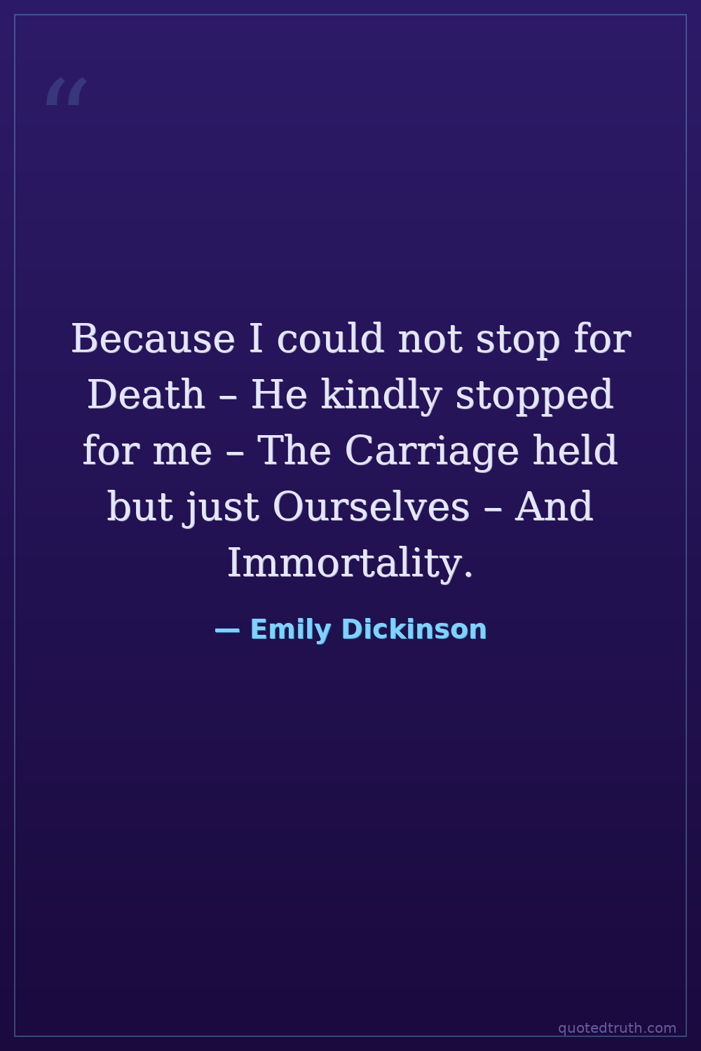 Because I could not stop for Death – He kindly stopped for me – The Carriage held but just Ourselves – And Immortality.