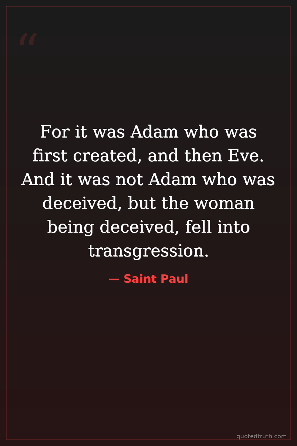 For it was Adam who was first created, and then Eve. And it was not Adam who was deceived, but the woman being deceived, fell into transgression.