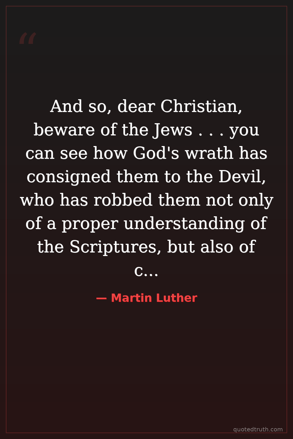 And so, dear Christian, beware of the Jews . . . you can see how God's wrath has consigned them to the Devil, who has robbed them not only of a proper understanding of the Scriptures, but also of common human reason, modesty and sense. . . . Thus, when you see a real Jew you may with a good conscience cross yourself, and boldly say, “There goes the Devil incarnate.”