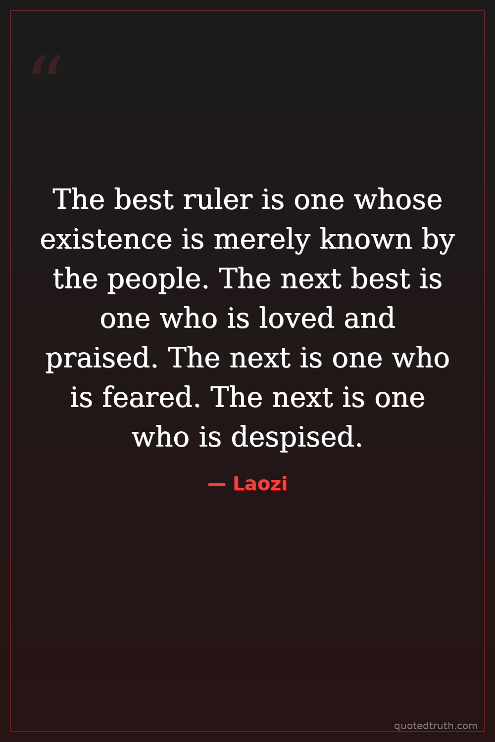 The best ruler is one whose existence is merely known by the people. The next best is one who is loved and praised. The next is one who is feared. The next is one who is despised.