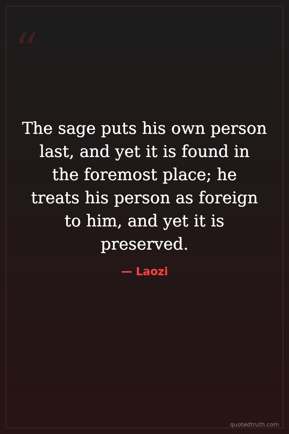 The sage puts his own person last, and yet it is found in the foremost place; he treats his person as foreign to him, and yet it is preserved.