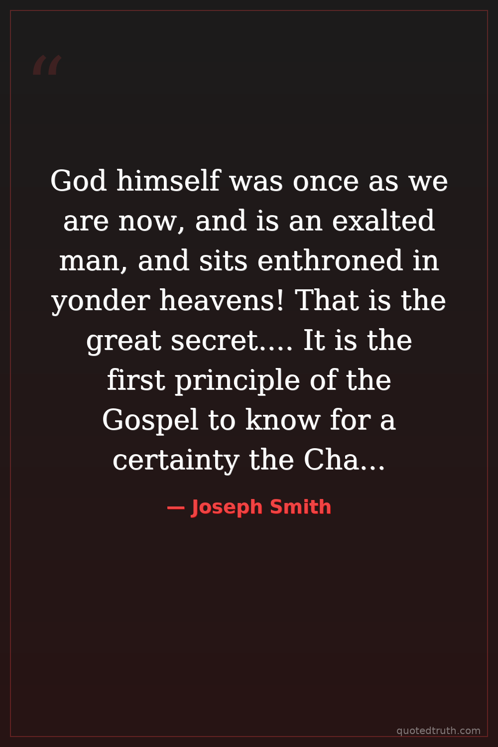 God himself was once as we are now, and is an exalted man, and sits enthroned in yonder heavens! That is the great secret.... It is the first principle of the Gospel to know for a certainty the Character of God, and to know... that he was once a man like us.... Here, then, is eternal life – to know the only wise and true God; and you have got to learn how to be Gods yourselves... the same as all Gods have done before you….