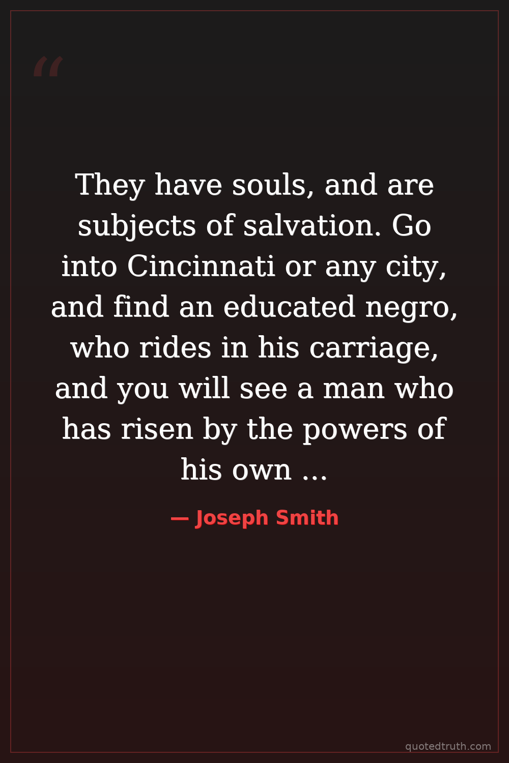 They have souls, and are subjects of salvation. Go into Cincinnati or any city, and find an educated negro, who rides in his carriage, and you will see a man who has risen by the powers of his own mind to his exalted state of respectability.