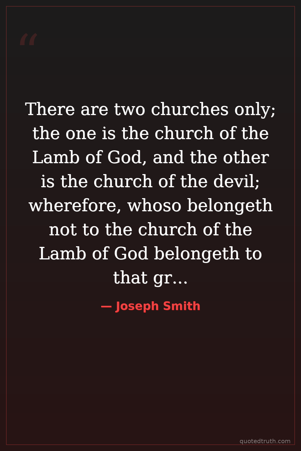 There are two churches only; the one is the church of the Lamb of God, and the other is the church of the devil; wherefore, whoso belongeth not to the church of the Lamb of God belongeth to that great church, which is the mother of abominations.
