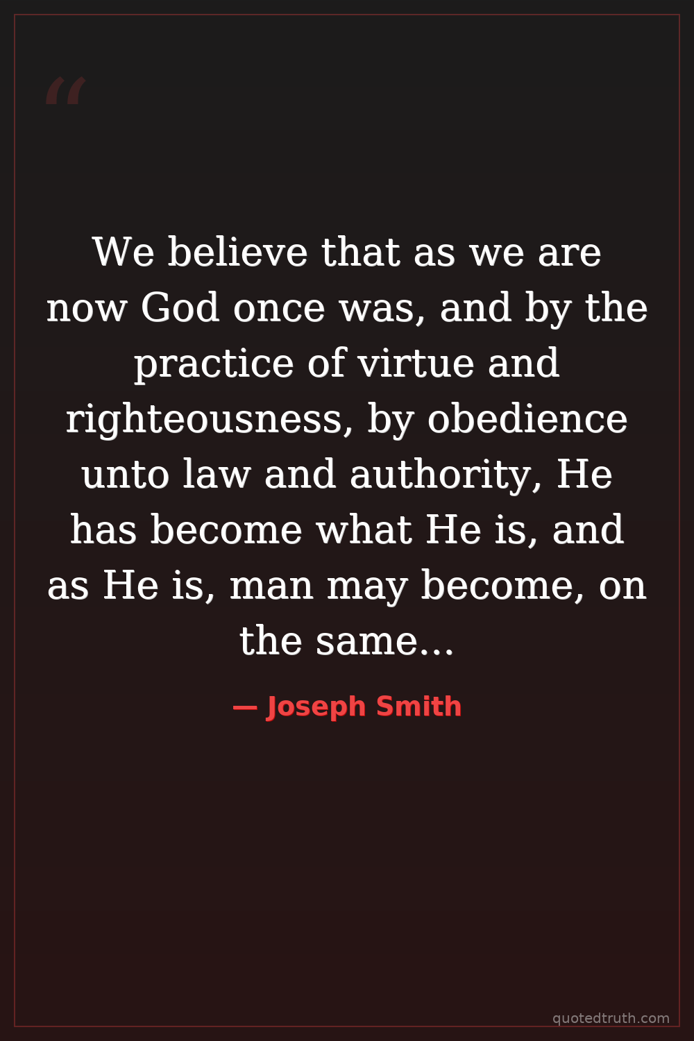 We believe that as we are now God once was, and by the practice of virtue and righteousness, by obedience unto law and authority, He has become what He is, and as He is, man may become, on the same principle.