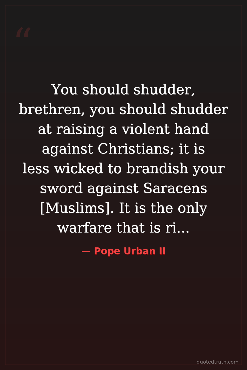 You should shudder, brethren, you should shudder at raising a violent hand against Christians; it is less wicked to brandish your sword against Saracens [Muslims]. It is the only warfare that is righteous, for it is charity to risk your life for your brothers.