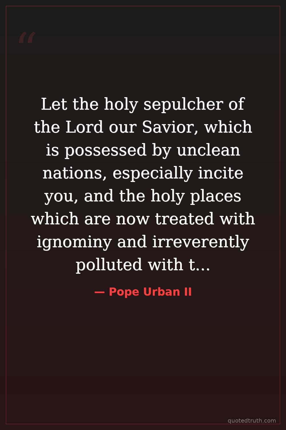Let the holy sepulcher of the Lord our Savior, which is possessed by unclean nations, especially incite you, and the holy places which are now treated with ignominy and irreverently polluted with their filthiness.