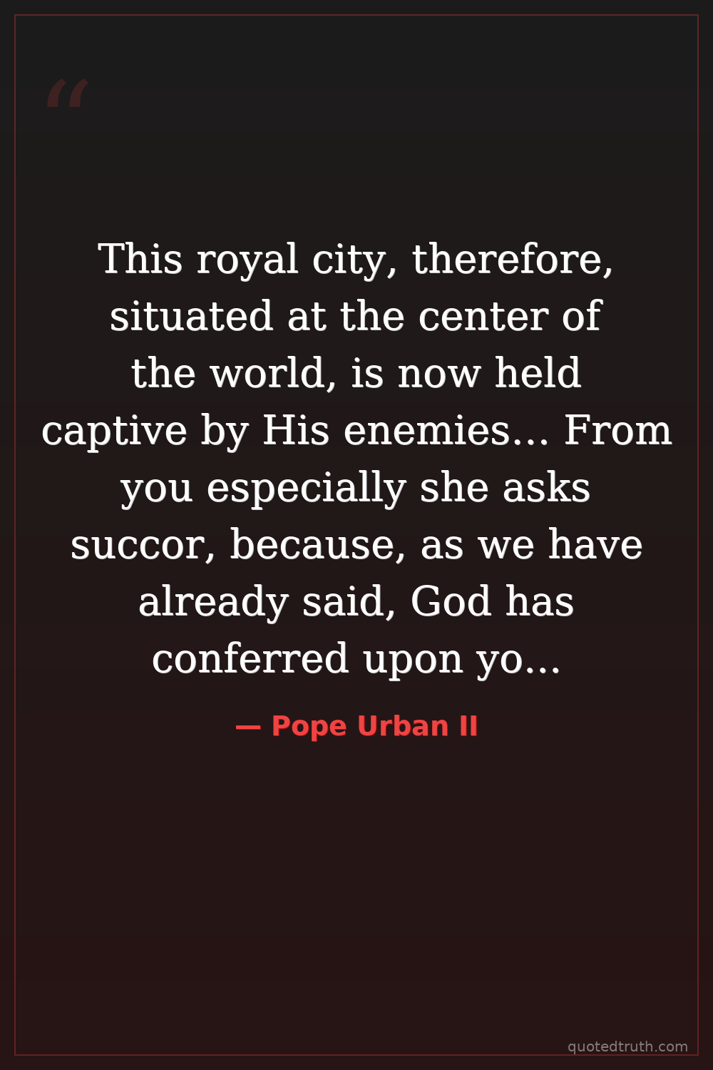 This royal city, therefore, situated at the center of the world, is now held captive by His enemies… From you especially she asks succor, because, as we have already said, God has conferred upon you above all nations great glory in arms.