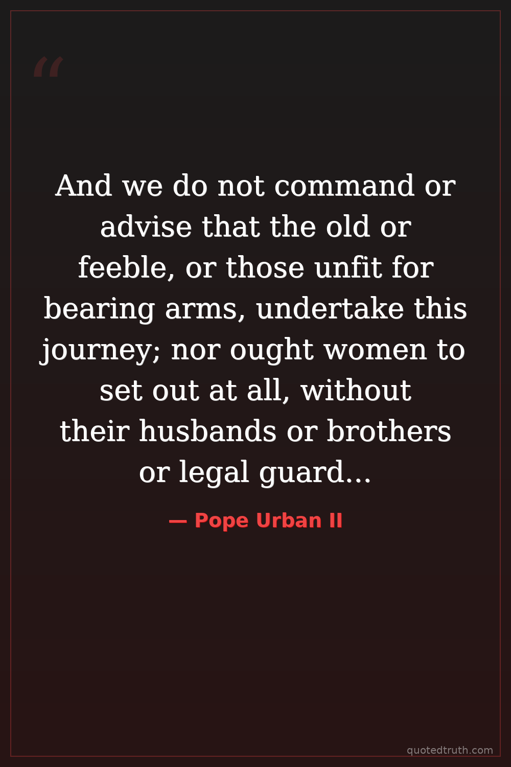 And we do not command or advise that the old or feeble, or those unfit for bearing arms, undertake this journey; nor ought women to set out at all, without their husbands or brothers or legal guardians. For such are more of a hindrance than aid, more of a burden than advantage.