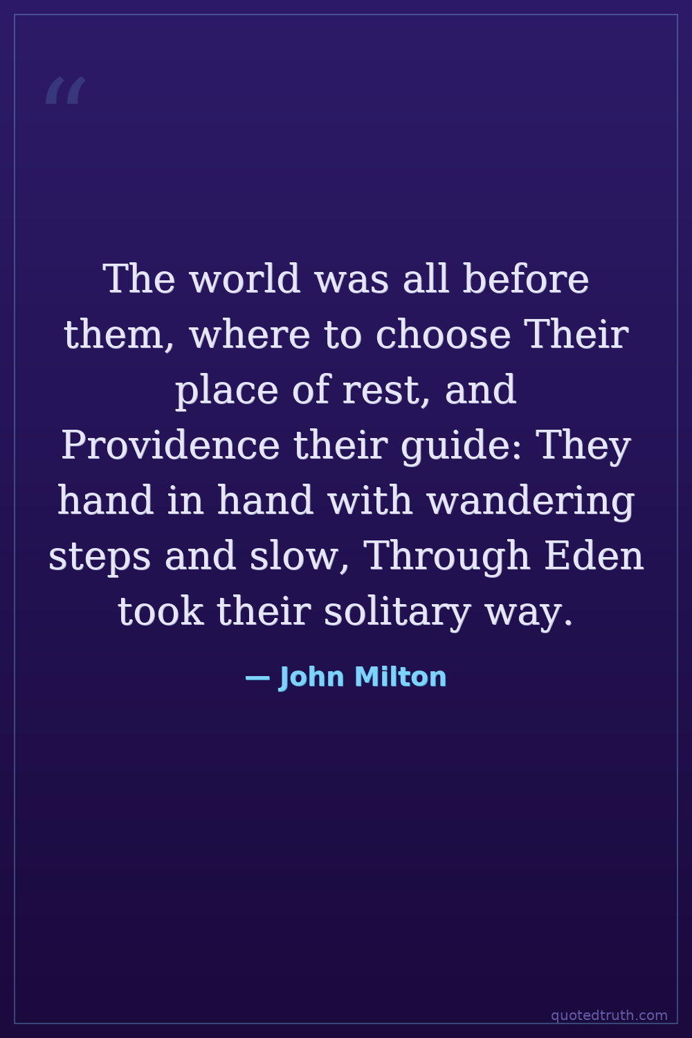 The world was all before them, where to choose Their place of rest, and Providence their guide: They hand in hand with wandering steps and slow, Through Eden took their solitary way.