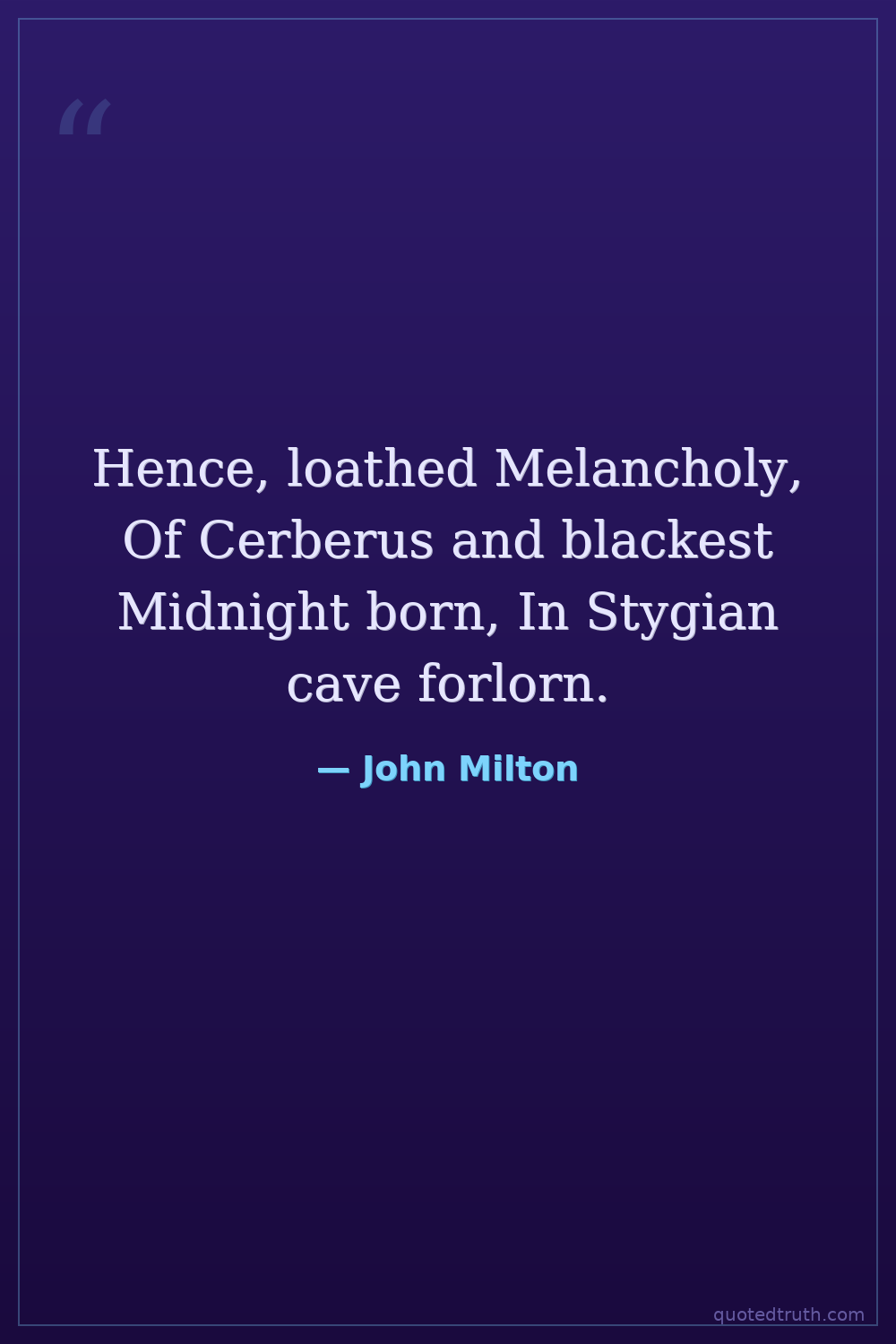 Hence, loathed Melancholy, Of Cerberus and blackest Midnight born, In Stygian cave forlorn.