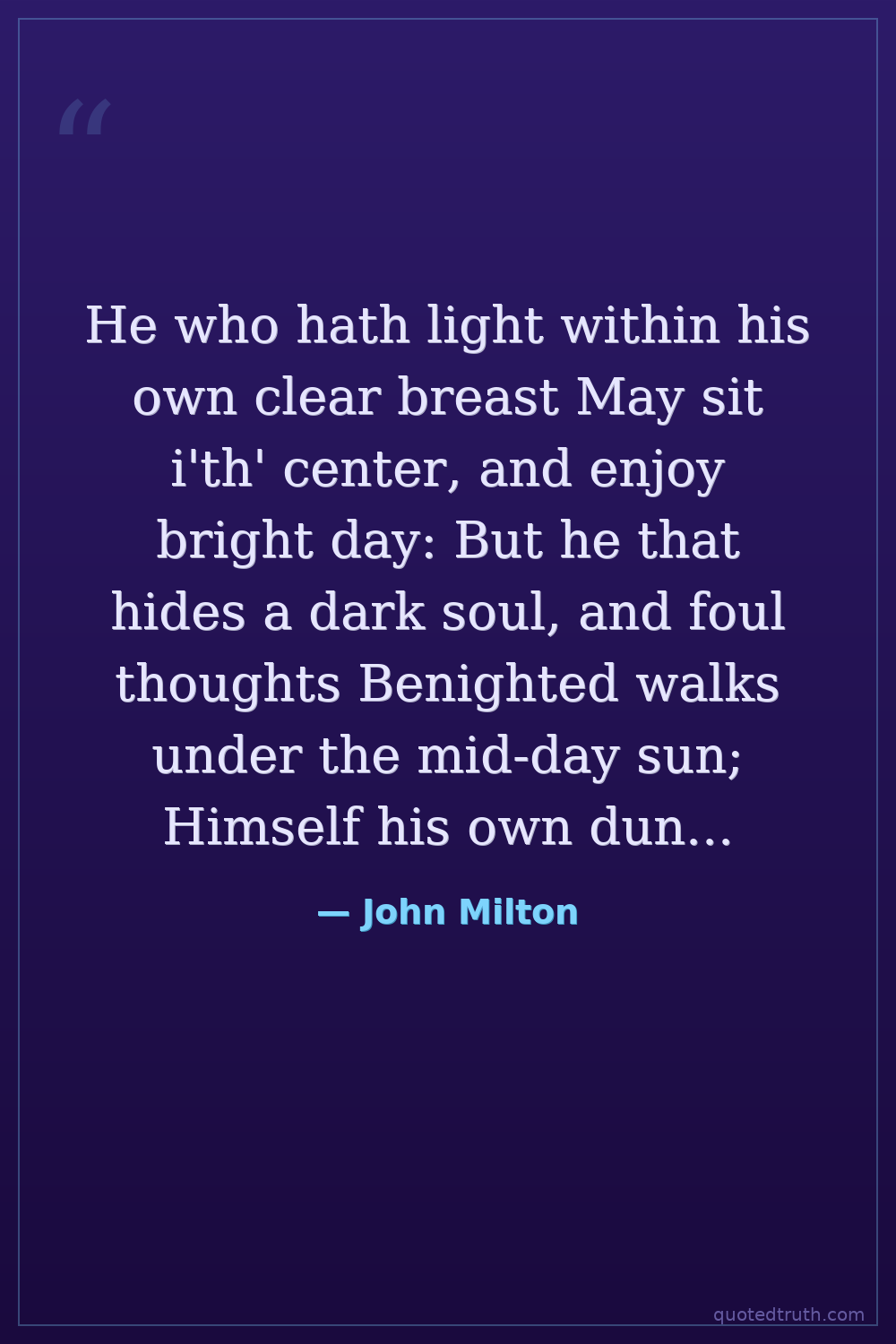 He who hath light within his own clear breast May sit i'th' center, and enjoy bright day: But he that hides a dark soul, and foul thoughts Benighted walks under the mid-day sun; Himself his own dungeon.